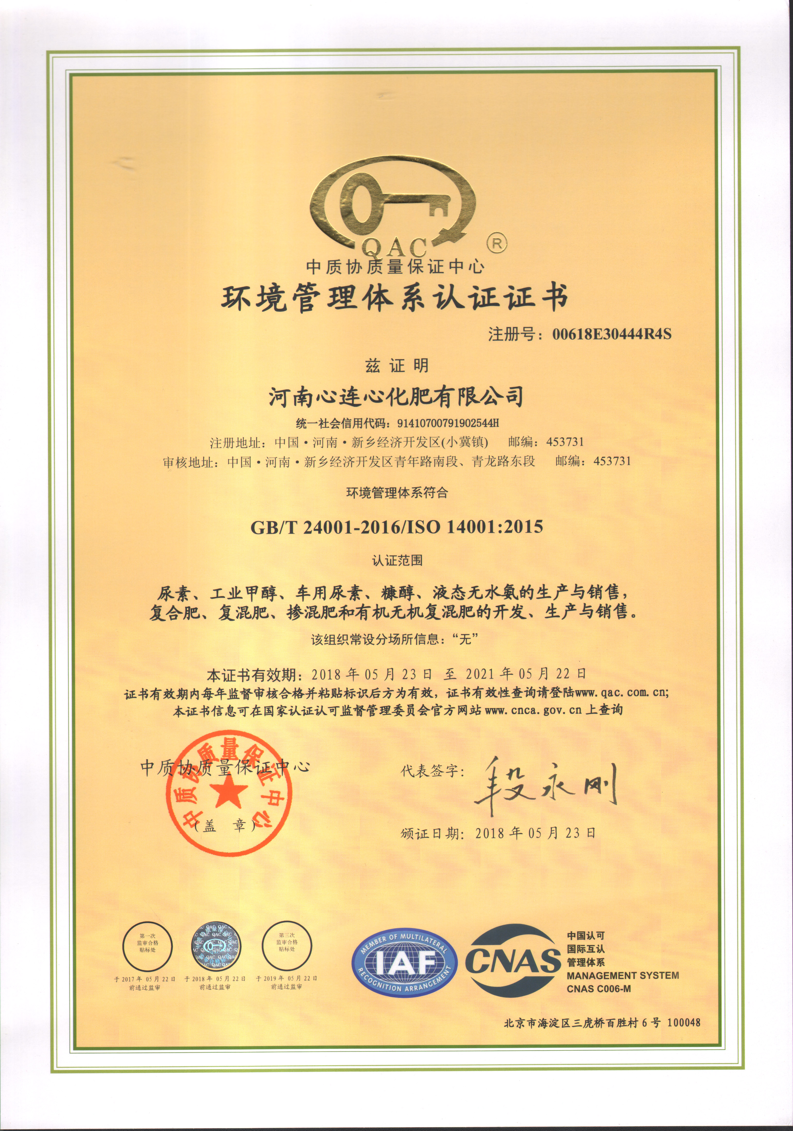 環(huán)境管理體系認(rèn)證證書