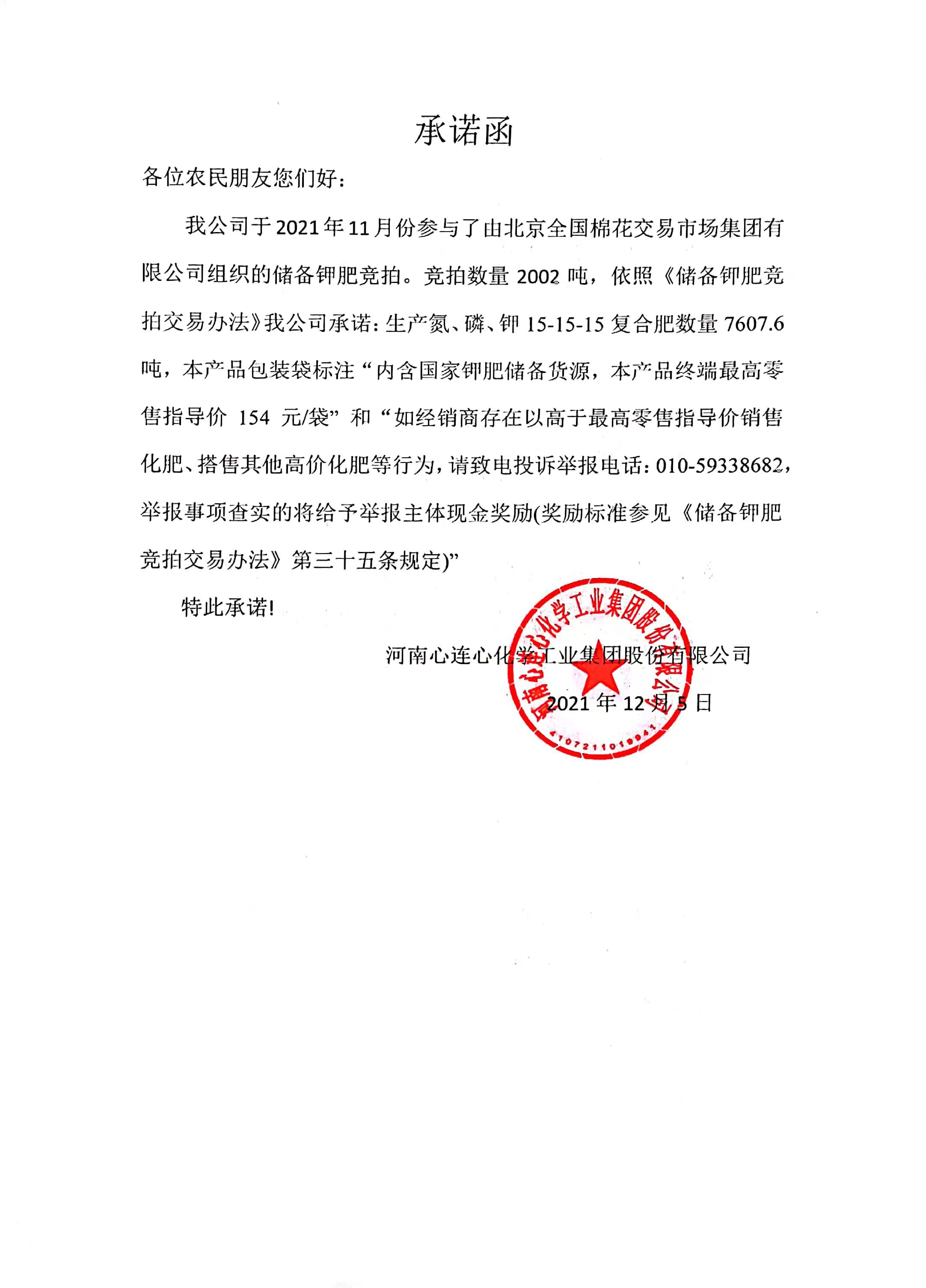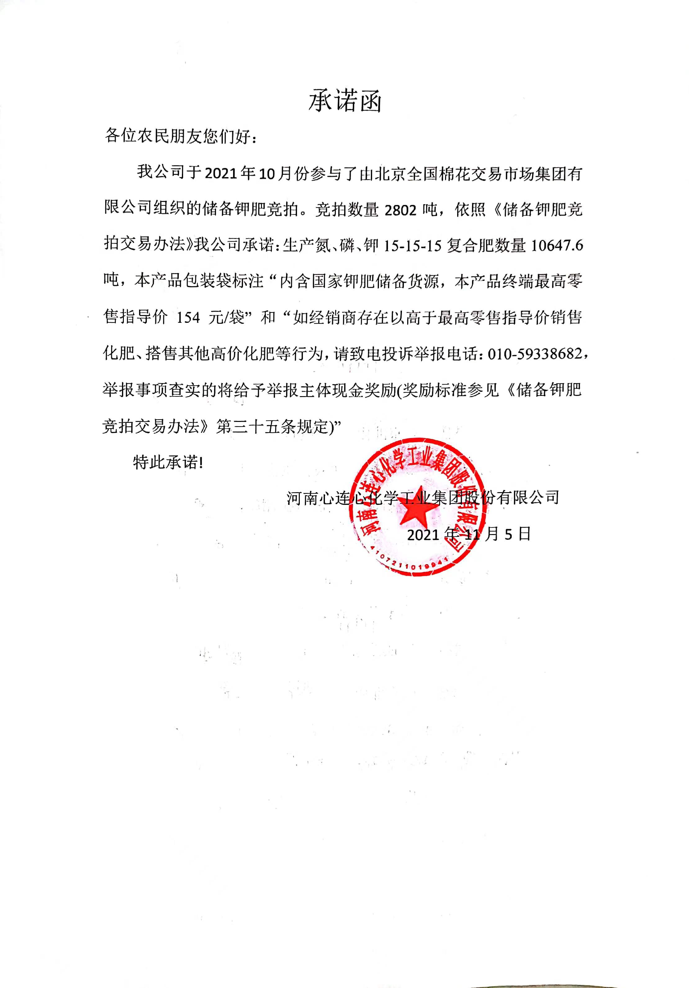 河南心連心化學(xué)工業(yè)集團(tuán)股份有限公司分別于2021年10月、11月份參與了由北京全國棉花交易市場集團(tuán)有限公司組織的儲備鉀肥競拍。依照《儲備鉀肥競拍交易辦法》公司做出以下承諾,詳見附件: